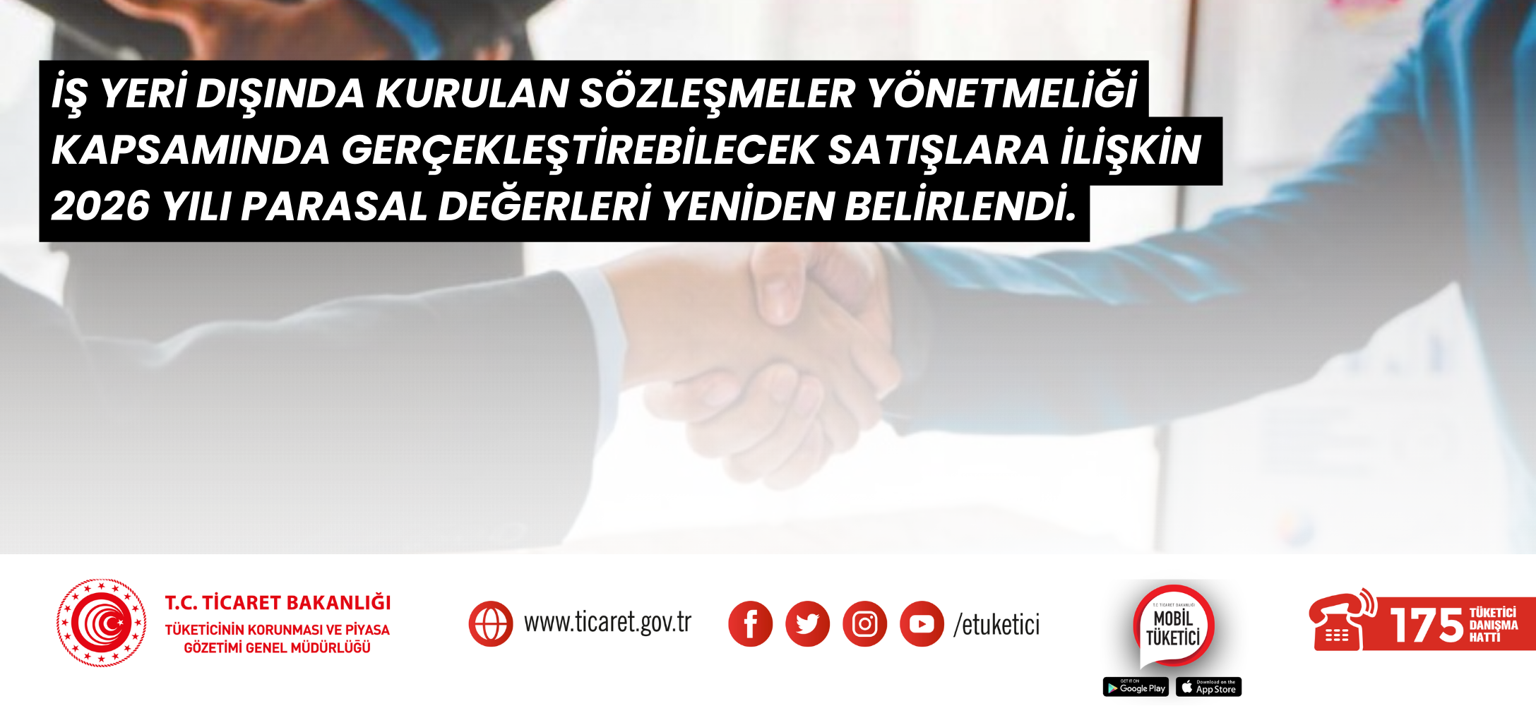 01.01.2026 tarihi itibarıyla, mal veya hizmet bedeli 313 Türk Lirasını aşmayan satışlar için İş Yeri Dışında Kurulan Sözleşmeler Yönetmeliği hükümleri uygulanmayacaktır.