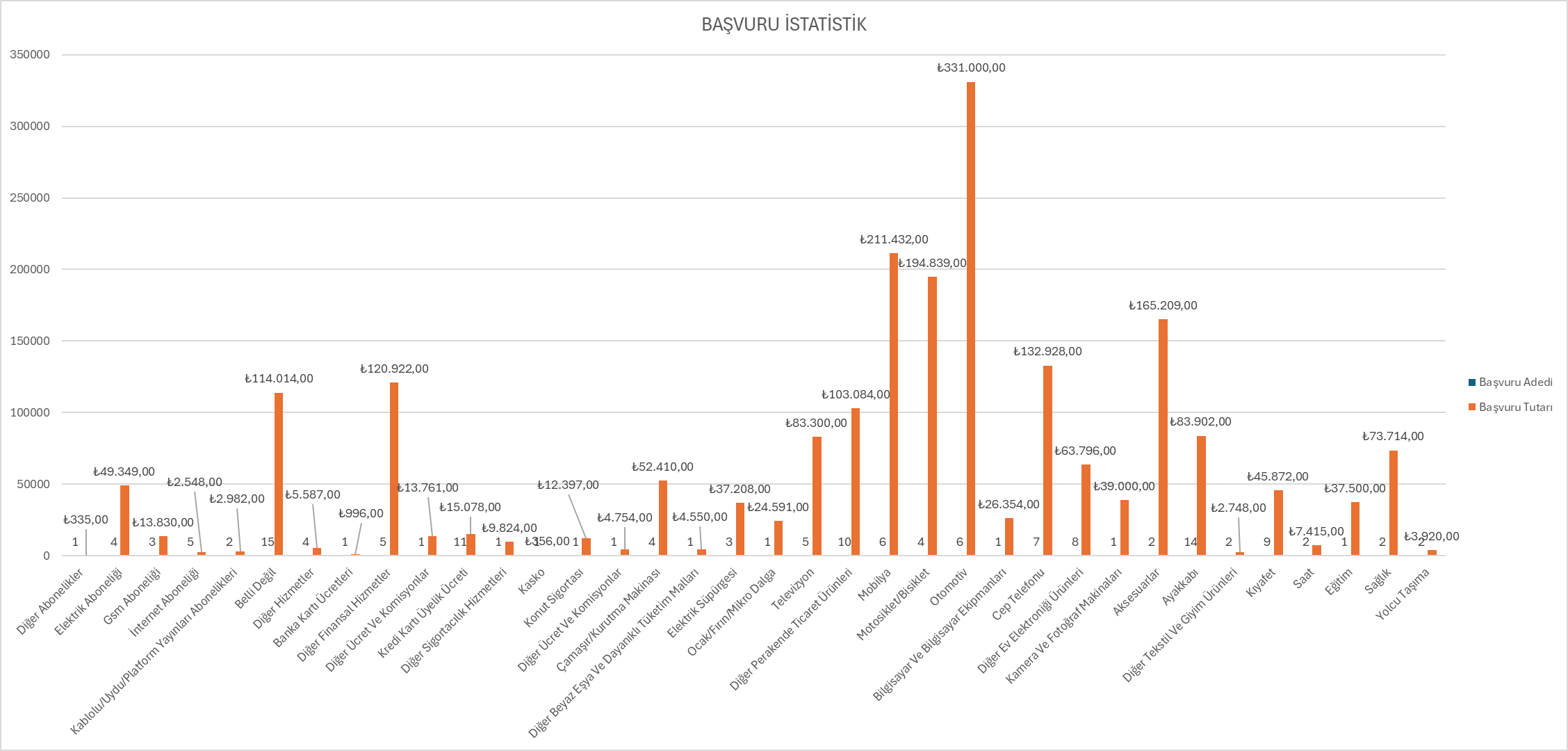Ay içinde yapılan toplam 147 adet başvuruda en çok 14 adet başvuru ile Ayakkabı , 11 adet başvuru ile kredi kartı üyelik ücreti , 10 adet başvuru ile diğer perakende ticaret ürünleri , 9 adet başvuru ile kıyafet , 8 adet başvuru ile diğer ev elektroniği ürünleri , 7 adet başvuru ile cep telefonu,6'şar adet başvuru ile mobilya ile otomotiv, 5'er adet başvuru ile televizyon, internet aboneliği ile diğer finanasal hizmetler, 4'er adet başvuru ile elektrik aboneliği, diğer hizmetler,çamaşır makinesi ile motorsiklet,3'er adet başvuru ile gsm aboneliği ile elektrik süpürgesi, şikayet edildi.
